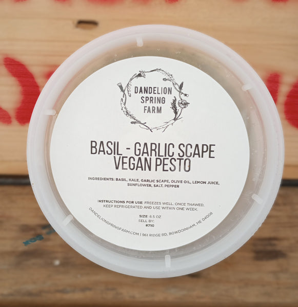 NEW! - Basil Garlic Scape Vegan Pesto - Ingredients: Basil, Garlic Scapes, Olive Oil, Lemon Juice, Sunflower, Salt, Pepper.